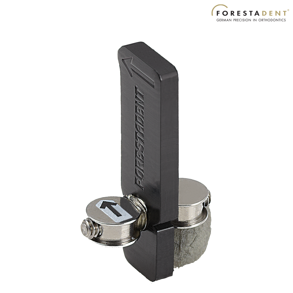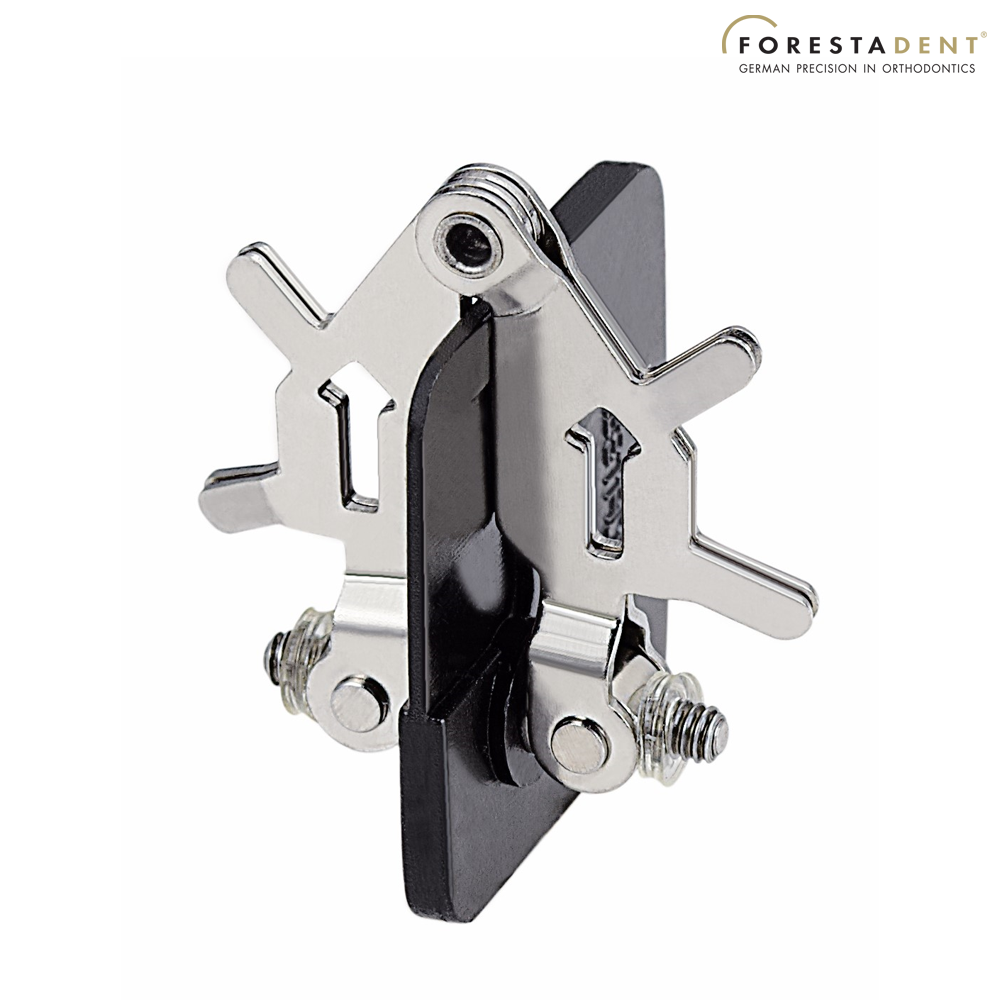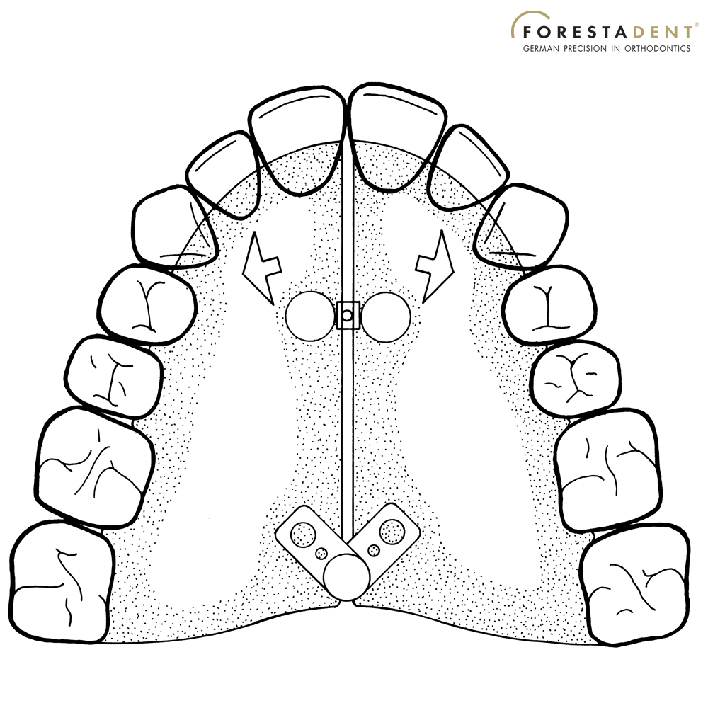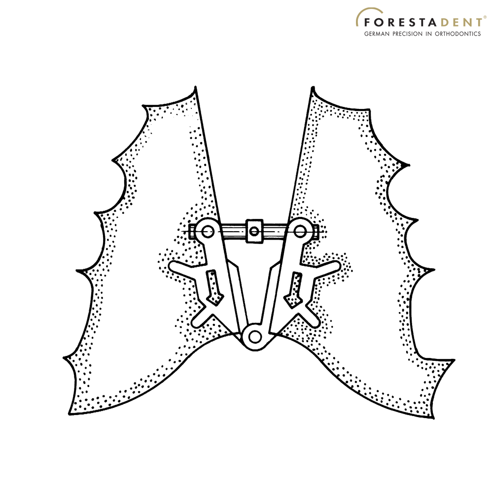 Surub tip evantai 2 componente Exp max 8 mm Rot 0,8 mm - Surub tip evantai pentru cresterea distantei intercanine. Balamaua si surubul sunt furnizate ca doua componente separate. Cele doua componente ale aparatului se deschid asemenea unui evantai. Balamaua tip eventai poate fi amplasata independent de surubul de expansiune. Expansiune max. 8 mm cu pas de 0.8 mm.