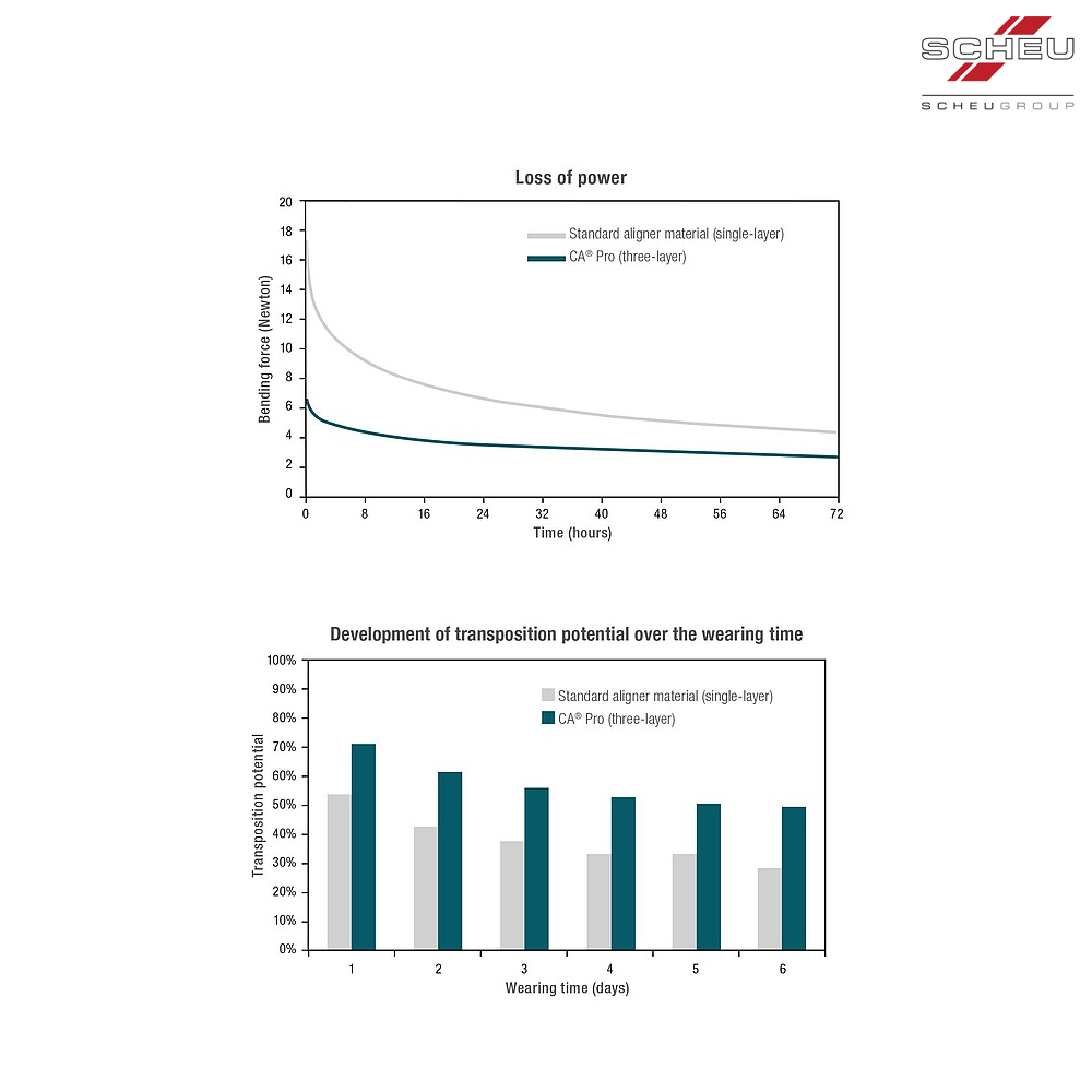 Folia CA Pro+ pentru alignere e formata din trei straturi cu miez elastomer flexibil intr-o carcasa dubla elastica, care este capabila sa mentina un nivel de forta constanta cu pierdere minima de forta. Stratul flexibil de elastomer asigura elasticitate ridicata si rezistenta la rupere, reducand in acelasi timp forta initiala si sporind confortul pacientului.